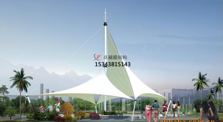 3.污漬:污漬也是在安徽張拉膜景觀中常見的疵病,特別是在早期選用PV膜材建成的一些張拉膜景觀.原因主要是在設于膜材外用PVC涂層隨時間推移老化/剝落所致.由于制作安裝缺陷導致膜面在焊接縫處留下污漬或不慎利物刮劃涂層,使織物直接接受紫外線的作用,時間久了也會出現局部污漬.