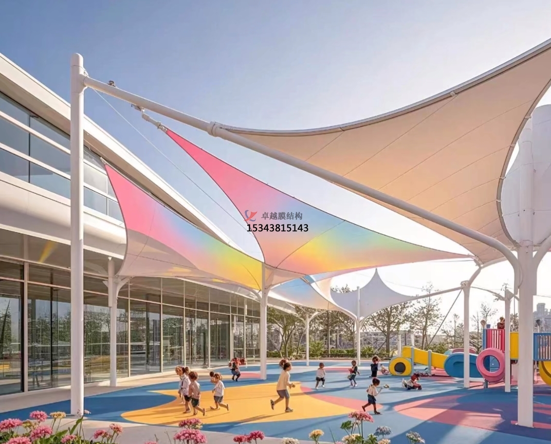 幼兒園膜結(jié)構(gòu)遮陽(yáng)棚是一種新型的建筑結(jié)構(gòu)形式,具有多種優(yōu)點(diǎn),如經(jīng)濟(jì)性、藝術(shù)性和美觀、透光、節(jié)能、環(huán)保、抗紫外線、耐候性好、使用壽命長(zhǎng)、大跨度無(wú)柱大空間、自重輕、抗震性能佳、防火、防潮、自潔等。它適用于多種使用環(huán)境,包括從阿拉斯加到沙特阿拉伯等廣泛的地區(qū),以及從單人帳篷、花園小品到覆蓋幾萬(wàn)、幾十萬(wàn)平方米的建筑等各種范圍。此外,膜結(jié)構(gòu)遮陽(yáng)棚的安全性也相對(duì)較高,適合在幼兒園等場(chǎng)所使用。