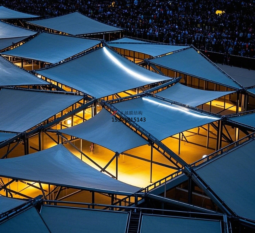 光影作用:大都膜材具有杰出的透光性,這一特性使得舞臺(tái)膜結(jié)構(gòu)在光影運(yùn)用上獨(dú)具優(yōu)勢(shì)。在白日,天然光透過(guò)膜材灑在舞臺(tái)上,構(gòu)成柔軟、均勻的光線,為扮演供給了天然、亮堂的環(huán)境,一起也能讓觀眾感受到與野外相似的氣氛。到了夜晚,經(jīng)過(guò)奇妙安置燈火,可以運(yùn)用膜材的透光性和半透明特性,創(chuàng)造出各種奇幻的光影作用。例如,在一場(chǎng)音樂(lè)會(huì)上,將彩色燈火投射在膜結(jié)構(gòu)舞臺(tái)上,膜材將光線散射開(kāi)來(lái),營(yíng)造出五彩斑斕、如夢(mèng)如幻的場(chǎng)景,與音樂(lè)的節(jié)奏和旋律相呼應(yīng),極大地增強(qiáng)了扮演的視覺(jué)沖擊力,為觀眾帶來(lái)一場(chǎng)震撼的視聽(tīng)盛宴。