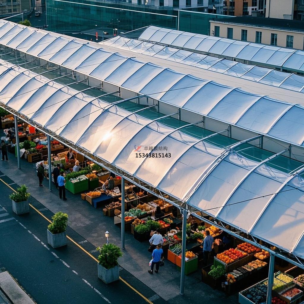 膜結構憑借其卓越的可塑性,能夠創造出豐富多樣的造型。在農貿市場的設計中,建筑師可以根據市場的整體風格、周邊環境以及功能需求,打造出各種獨特的形態。無論是流暢的曲線造型,還是富有幾何感的多邊形結構,都能為市場增添現代感與藝術氣息。例如,一些農貿市場采用了類似帳篷的尖頂膜結構設計,不僅增加了空間的層次感,還能在視覺上給人以開闊、通透的感覺;而另一些則運用了連續的拱形膜結構,營造出溫馨而有序的購物氛圍。?