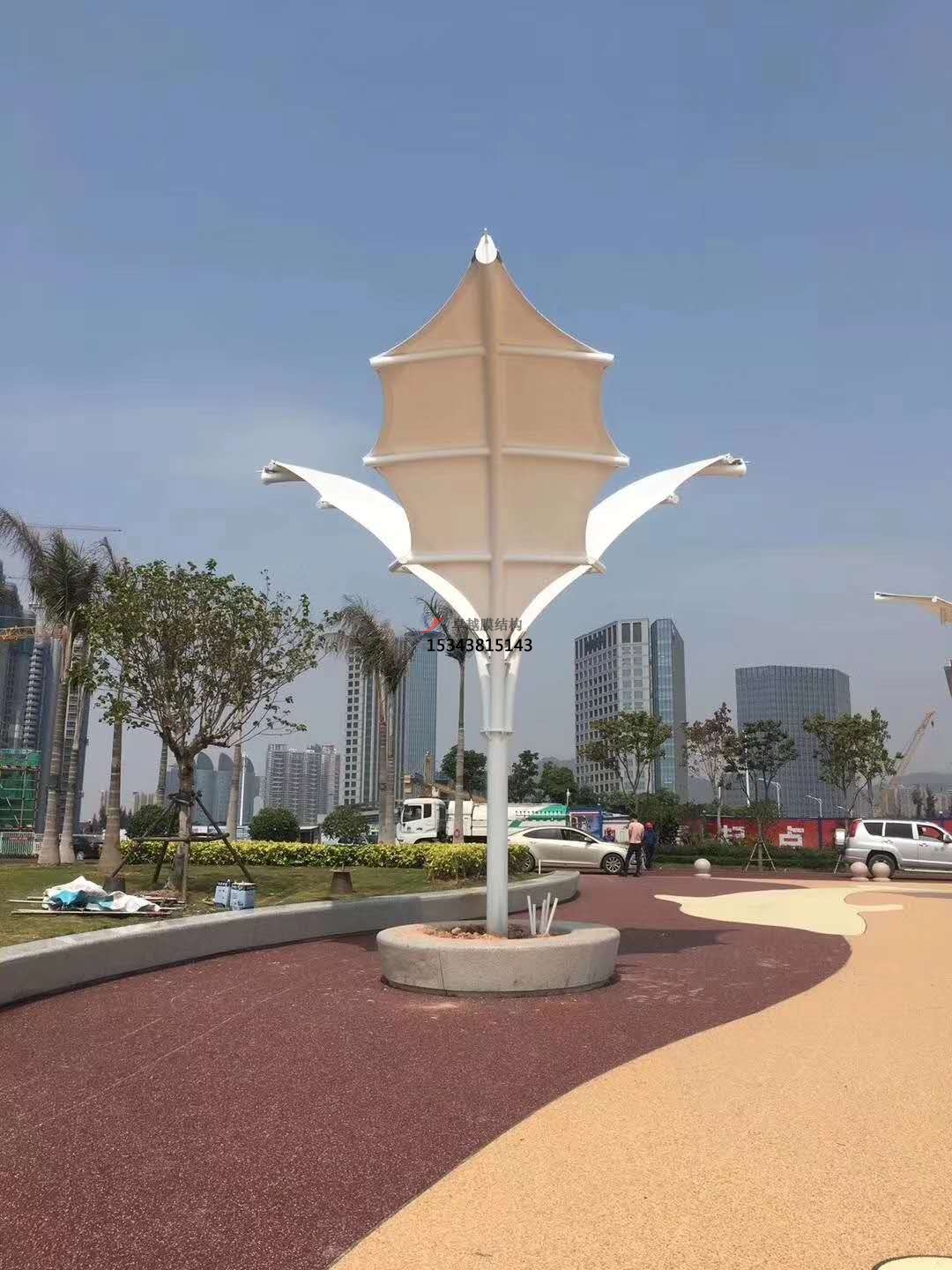 2、一個城市的中心區反映一個城市的地理風貌和民族風情,同時,也是一個城市文化發展程度的標志。而景觀設計要求其具有廣泛的可讀性、雅俗共賞,既有超凡脫俗的藝術價值,又能使大眾喜聞樂見與大眾息息相通。張拉膜以其輕盈飄逸的造型、柔美并帶有力量的曲線和大跨度和大空間的鮮明個性和標識性,應用于城市小品設計中。