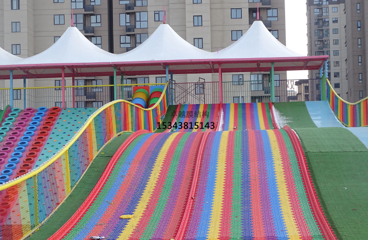 彩虹滑道遮陽棚的設計風格與周圍環境相協調,色彩鮮艷、造型獨特,給孩子們帶來視覺上的愉悅。此外,遮陽棚還具有良好的通風效果,即使在炎熱的夏天,也能保持空氣流通,讓孩子們感覺更加舒適。