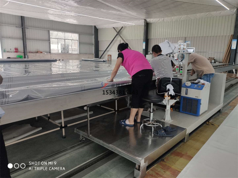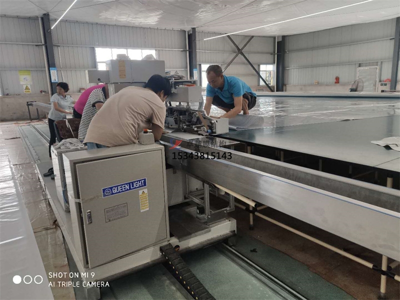 下面小編就給各位看官分享一下我廠膜材加工過程中的一組照片。 無塵焊接中,膜材在平臺固定,軌道機滑動焊接。
