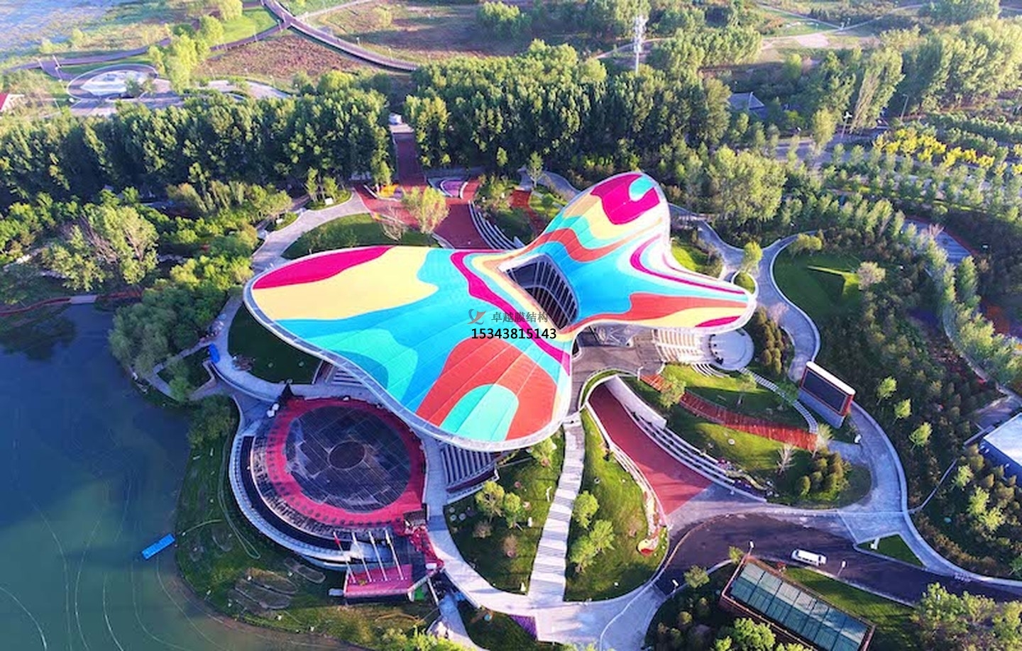 ETFE膜材除了常規(guī)的透明、藍(lán)色、白色、銀色鍍點(diǎn)外,其實(shí)還有五顏六色的彩色系列。今天就給大家介紹一個(gè)ETFE彩色膜應(yīng)用的經(jīng)典案例:2019的北京世園會(huì)的主場(chǎng)館——媯汭劇場(chǎng),外觀為彩色蝴蝶造型。