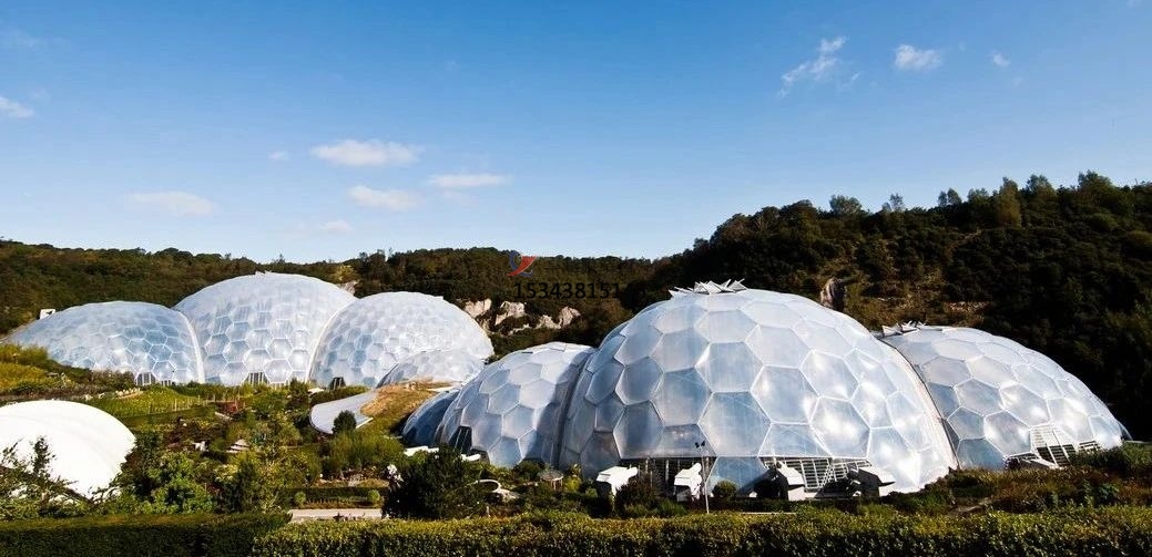 “伊甸園”項目位于英國的康沃爾郡,是在廢棄的礦山上建的全球最大的生態溫室。主要由8個充滿未來主義色彩的巨大蜂巢式穹頂建筑構成,其中每4座穹頂狀建筑連成一組。“伊甸園”的穹頂穹頂架由鋼管構成,拼成尺寸9米大小的六角形天窗,天窗中間鋪設半透明的ETFE薄膜材料。在形態上像放大了無數倍的“大水泡”。"大水泡"里培育著原產于非洲、亞洲、歐洲、大洋洲和美洲的熱帶植物。
