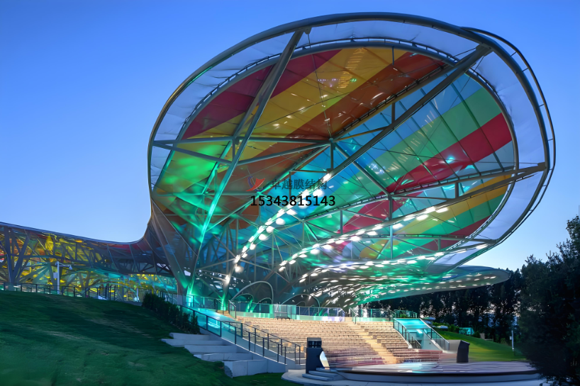 ETFE膜是一種厚度小于0.4毫米,呈透明形態的超薄膜材,它的透光率可以根據建筑需求進行調節制定。劇場使用的膜透光率在20%至40%之間,用于屋面結構可以起到“透光不透視”的效果,既可最大限度利用自然光線,實現柔和采光,又可避免五彩斑斕的色彩對人的視覺干擾。