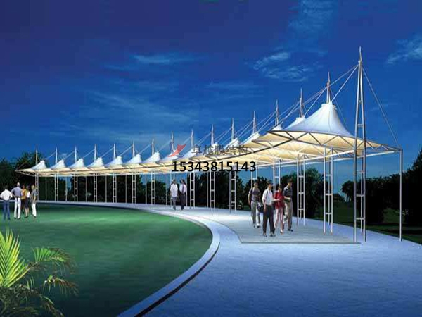 (2)膜結(jié)構(gòu)藝術(shù)性。膜結(jié)構(gòu)突破了傳統(tǒng)的建筑結(jié)構(gòu)類(lèi)型,以造型學(xué)、色彩學(xué)為依托,可結(jié)合自然條件,充分發(fā)揮建筑師的想象力,根據(jù)創(chuàng)意建造出傳統(tǒng)建筑難以實(shí)現(xiàn)的曲線及各種造型,且色彩豐富,富有時(shí)代氣息,體現(xiàn)結(jié)構(gòu)構(gòu)件受力之美。配合燈光易形成夜景,給人以現(xiàn)代美的享受。