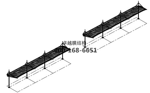 膜材采用白色高端國產星益達高自潔環保建筑膜材,鋼結構采用更好的標準Q235B鋼材,表面采用酚醛底漆處理,面漆采用白色鋼結構專用快干磁漆。
