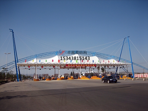 四、收費站膜結構罩棚在結構的穩定性,耐久性、抗風性、抗雨雪性對比傳統的彩鋼板有著不可比擬的優勢,膜結構本身的應力結構在遇到雨雪天氣膜結構本身的結構特性也可以保證其大跨度的抗壓穩定性。