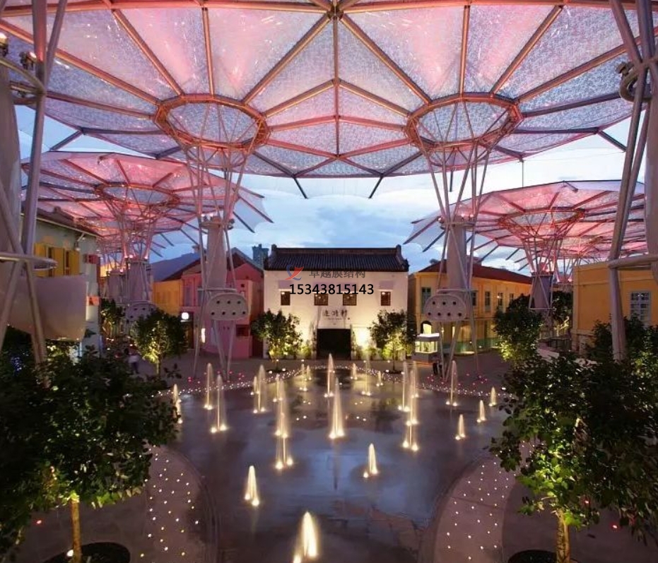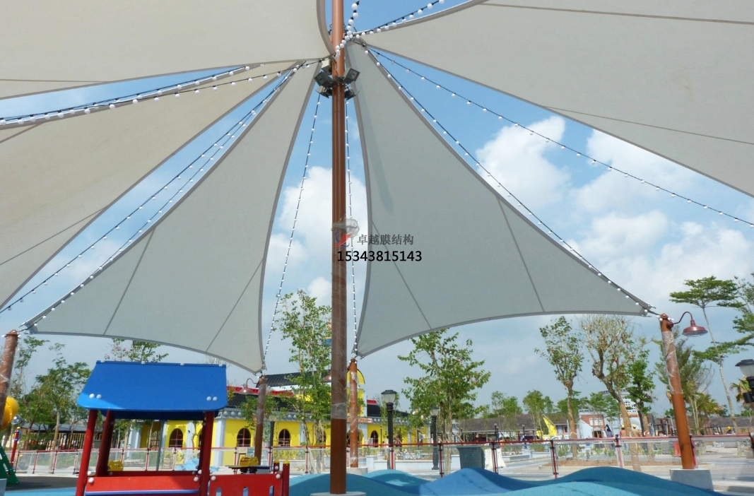 3‌、多功能性‌:除了遮陽(yáng)功能外,膜結(jié)構(gòu)遮陽(yáng)棚還可以作為陽(yáng)雨棚、涼亭、連廊等使用。其構(gòu)思獨(dú)特、因地制宜的設(shè)計(jì),使得遮陽(yáng)棚在賦予景觀小品藝術(shù)化的同時(shí),也將功能實(shí)用性融入其中,提升了游樂(lè)場(chǎng)的整體品質(zhì)。
