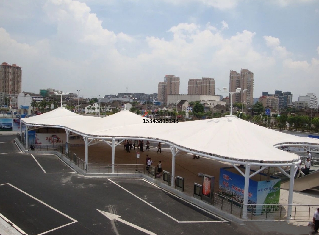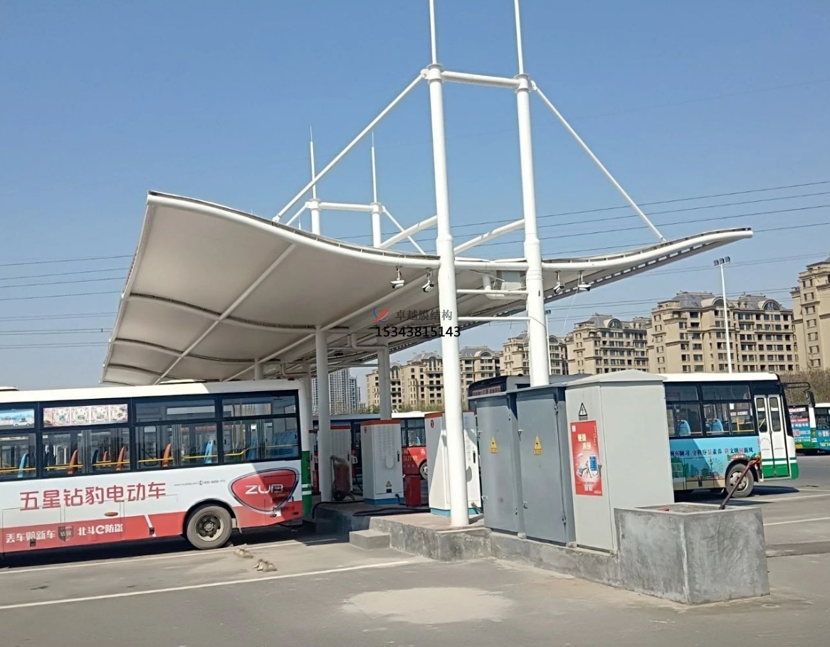 膜結構車棚在此發揮了重要作用。一般采用骨架式,先用鋼材制成骨架,然后安裝膜材,通過加強構建(鋼索、鋼柱)使其內部產生一定的張力行程車棚形狀,能夠承受一定的風載荷跟雪載荷。使用張拉式的也比較多。也有使用充氣式的,這種比較高端維護成本比較高使用比較少。