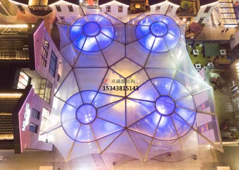 膜結構以高強度柔性薄膜(如ETFE、PVDF)為核心材料,結合鋼索、桁架等支撐體系,形成兼具輕量化與高穩定性的空間曲面12。其自重僅為傳統鋼構的1/3,大幅降低基礎造價,同時支持50米以上無柱大跨度設計,為商業廣場創造開闊通透的公共空間。ETFE氣枕膜通過多層鍍點設計,可智能調節透光率與紫外線過濾效率,例如嘉興長安里商業街的天幕結構,既能實現光線漫射營造柔和氛圍,又能有效阻隔70%以上的紫外線輻射。