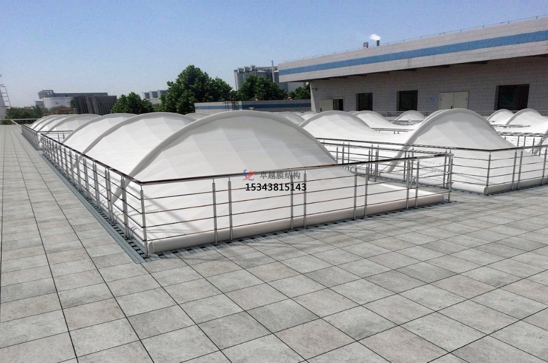 膜結(jié)構(gòu)污水池蓋主要由膜材、鋼構(gòu)骨架、檢修通道等部分組成。其中,膜材是覆蓋在污水池上面的主要材料,具有抗老化、耐腐蝕、阻燃性等特點(diǎn),同時(shí)膜材還具有高透光性,能夠充分保證自然光的利用。鋼構(gòu)骨架則是支撐膜材的框架,需要根據(jù)污水池的尺寸和形狀進(jìn)行設(shè)計(jì)。檢修通道是為了方便人員在膜結(jié)構(gòu)下方進(jìn)行設(shè)備維修和檢查而設(shè)置的。