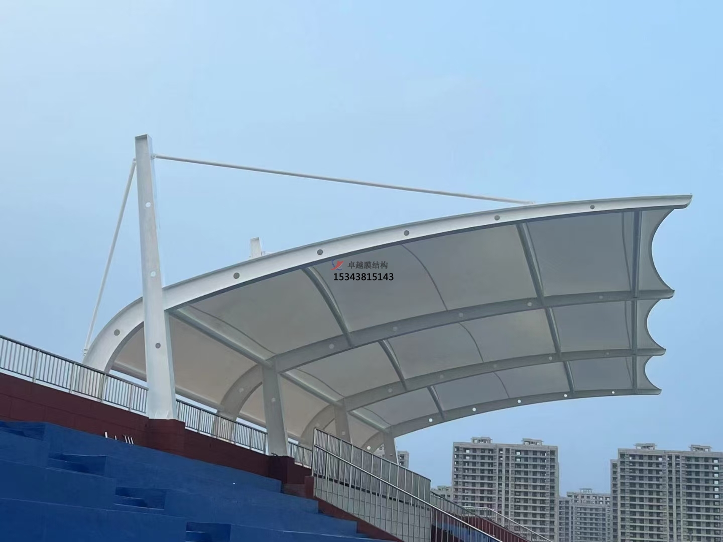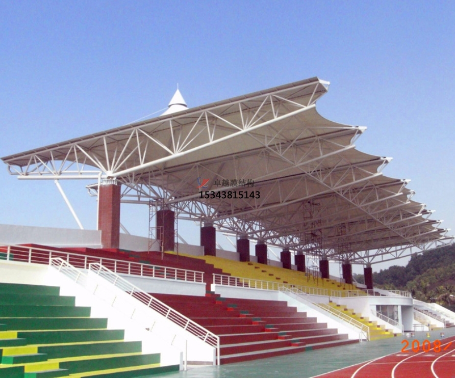 膜結構看臺是一種全新的建筑結構形式,它集建筑學、結構力學、精細化工與材料科學、計算機技術等為一體,具有很高技術含量。其曲面可以隨著建筑師的設計需要任意變化,結合整體環境,建造出標志性的形象工程。