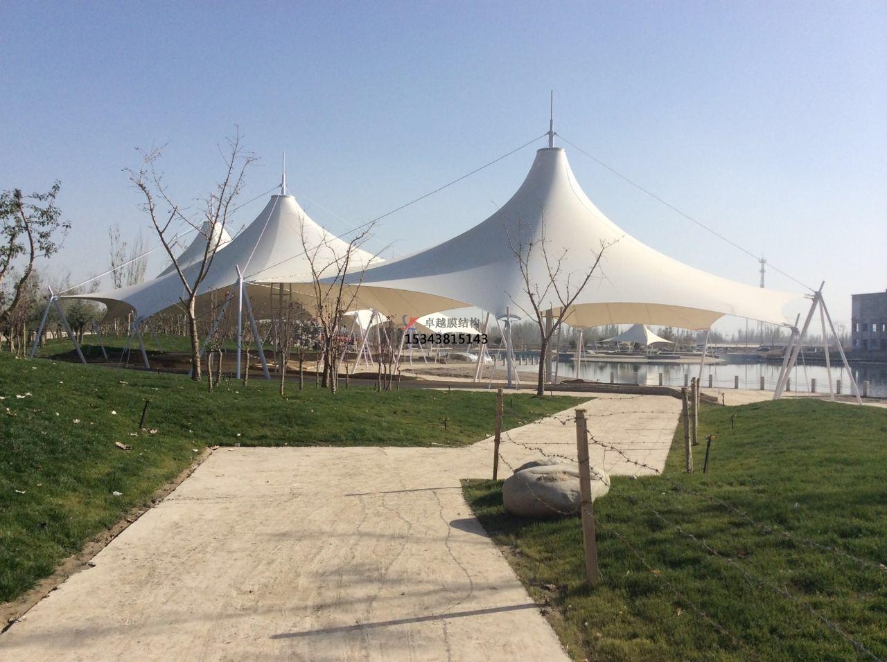 根據結構形式的不同,張拉膜景觀可分為3類:骨架式張拉膜景觀、充氣式張拉膜景觀和張拉式張拉膜景觀。骨架式張拉膜景觀是在鋼架或其他材料的骨架上鋪裝膜材料,由此構成屋頂或外墻壁的構造形式。造型包括平面形,單曲面形,和以鞍形為代表的雙曲線形。充氣式張拉膜景觀是向由張拉膜景觀構成的室內充入空氣,并保持室內空氣的壓力始終大于室外空氣壓力,由此使膜材料處于張力狀態來抵抗負載及外力的構造形式,分單層結構和雙層結構兩種形式。張拉式張拉膜景觀是通過拉索將膜材料張拉于結構上而形成的構造形式,膜表面通過自身曲率變化達到內外力平衡。