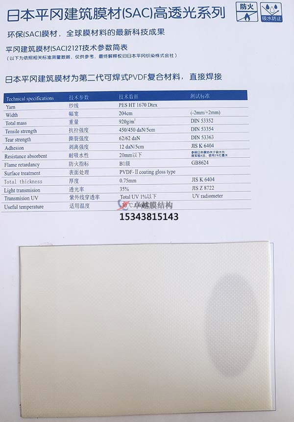 來自日本百年老店的膜材料,世界更早更著名的膜材生產廠家世界更早誕生膜結構的地方,世界好的能生產抗紅外線環保節能隔熱膜材的廣家。 全球僅有的兩家級防火膜材生產廠家之一2世界更大膜結構企業大陽工業專用膜材.2010世 博會世博四及部分場館合作...它在中國的出現,必將改變中國的膜結構市場,讓中國的膜結構工程質量達到世界一流水平!