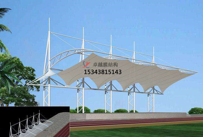 看臺膜結(jié)構(gòu)是用高強(qiáng)度柔性薄膜材料經(jīng)受其它材料的拉壓作用而形成的穩(wěn)定曲面,能承受一定外荷載的空間結(jié)構(gòu)形式。 其造型自由、輕巧、美,充滿力量感,阻燃、制作簡易、安裝快捷、節(jié)能易于、使用安全等優(yōu)點(diǎn).因而使它在世界各地受到廣泛應(yīng)用。