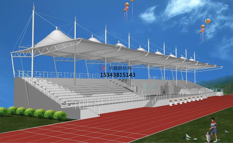 張拉膜看臺主要用于各類地方體育場主席臺雨棚,各類學(xué)校體育場看臺雨棚遮蓋,我公司是國內(nèi)較早從事大懸挑張拉膜結(jié)構(gòu)看臺設(shè)計(jì)施工的專業(yè)廠家,下面介紹一下我們在北京市周邊縣市完工的一些張拉膜看臺設(shè)計(jì)施工案例,我公司先后在北京周邊承接了北京市第八中學(xué)張拉膜看臺雨棚、北京市第四中學(xué)張拉膜張拉膜看臺罩棚、北京中學(xué)張拉膜看臺遮陽棚等設(shè)計(jì)施工項(xiàng)目,簡介如下: