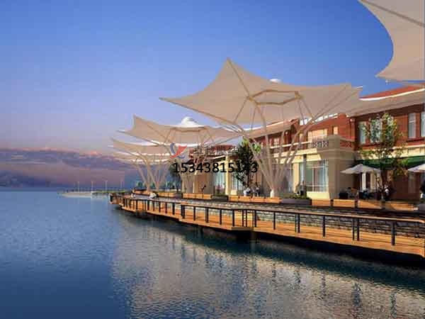 膜結構景觀棚所用膜材料由基布和涂層兩部分組成。膜結構具有強度低、彈性大、易老化、徐變大、自潔性差,但價格便宜,容易加工制作,色彩豐富,抗折疊性能好等等特點。