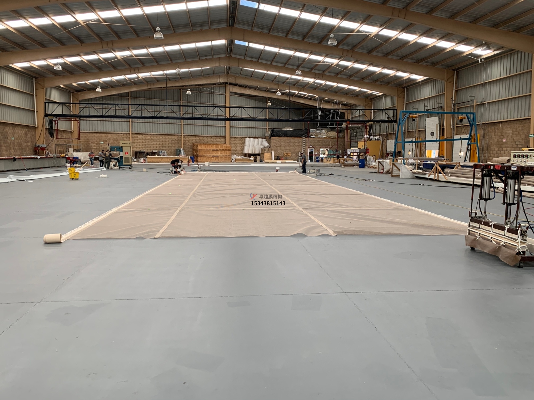 膜結構工程的加工制造膜材的首要加工流程包含: 進料-查驗膜材-膜片下料-編號-膜片編排放樣-膜片初粘-駁接-包裝。因為膜材的裁剪、包裝進程都較為復雜, 各種角度改變較多, 且加工精度請求非常高, 所以在制造進程中要加強質量管理, 保證制造精度。