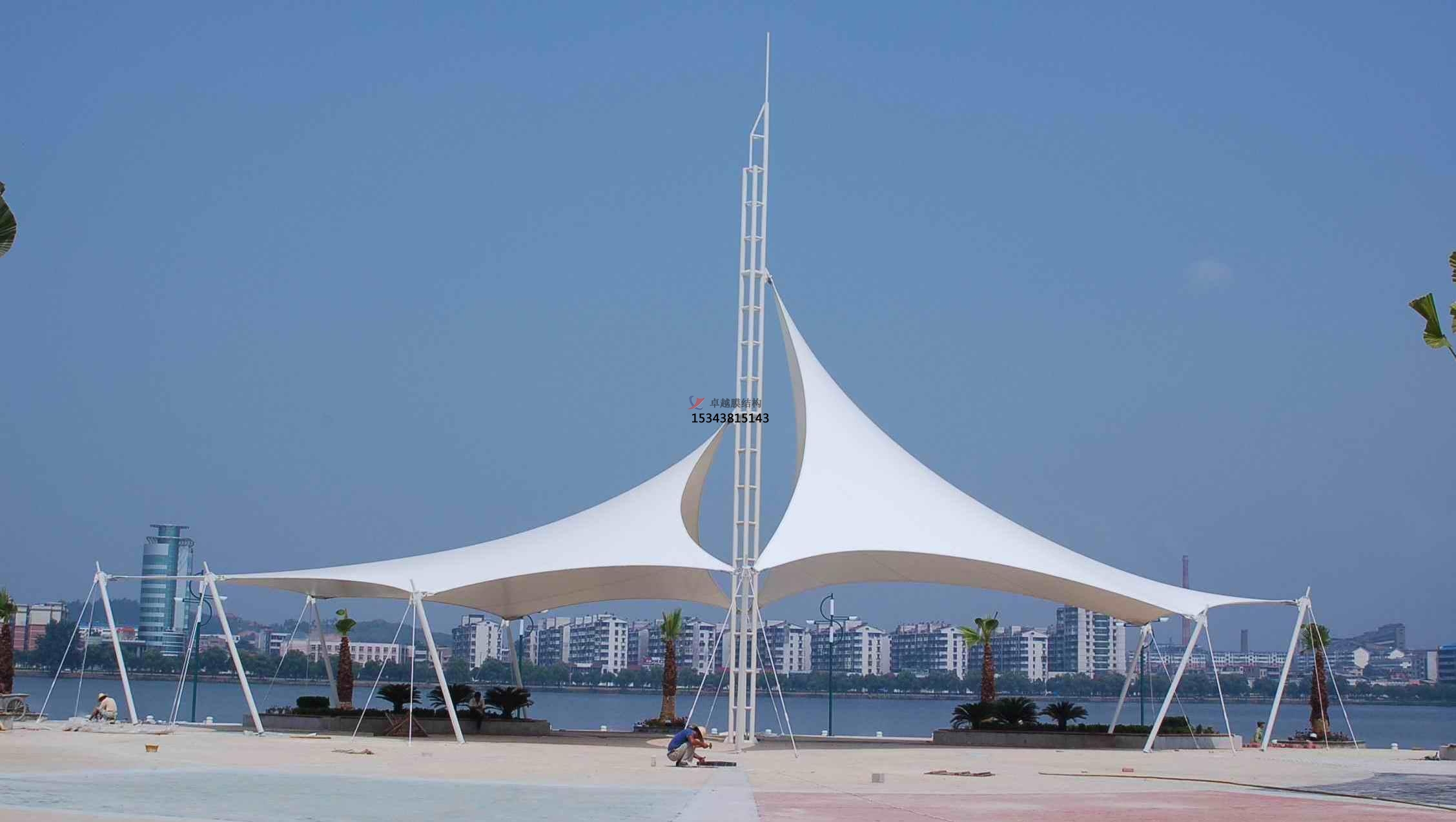 膜結構景觀是一種全新的建筑結構形式,它集建筑學、結構力學、精細化工與材料科學、計算機技術等為一體,具有很高技術含量。其曲面可以隨著建筑師的設計需要任意變化,結合整體環境,建造出標志性的形象工程。