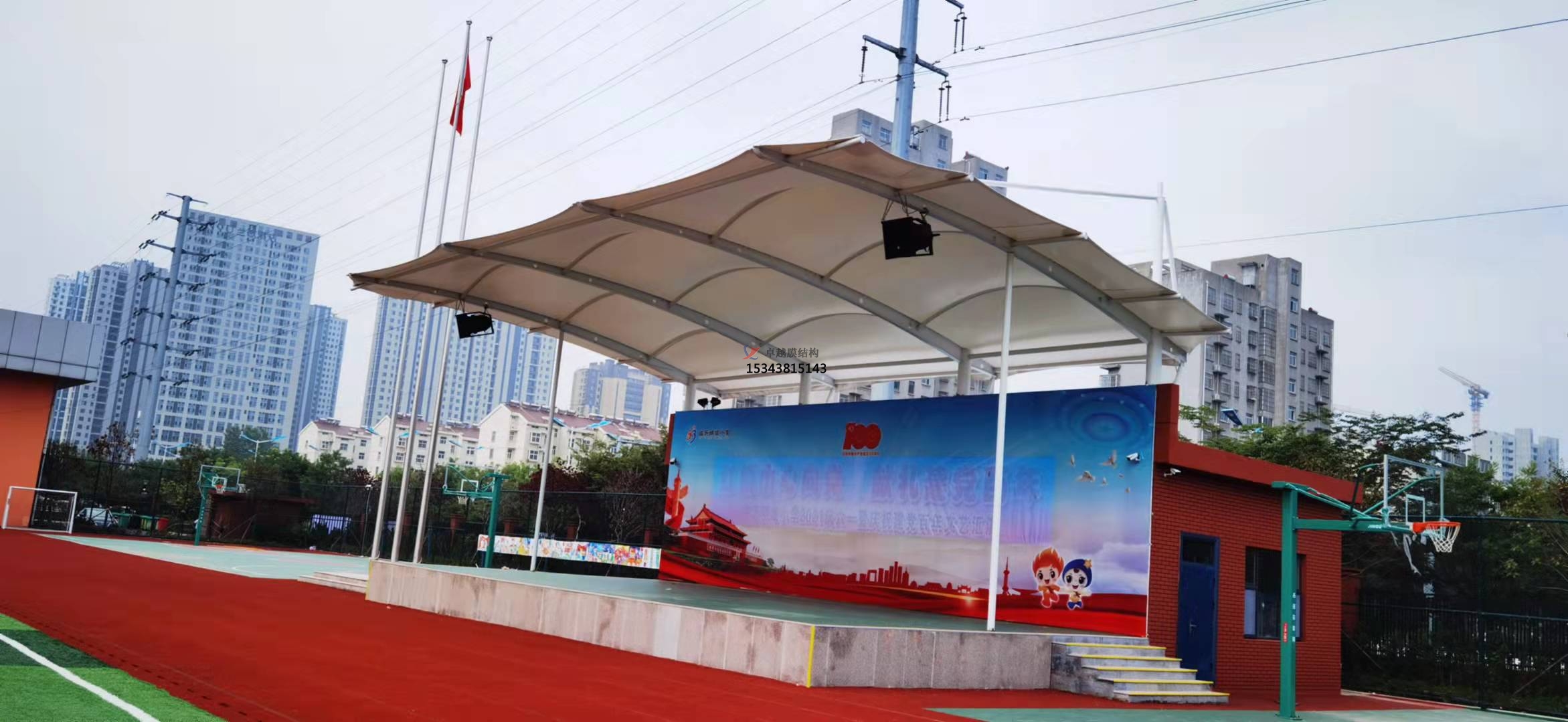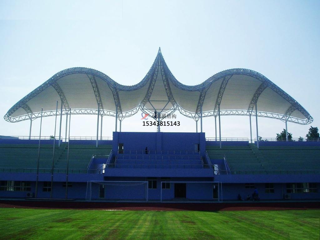 膜結構看臺在體育設施上主要應用在學校操場運動看臺或主席臺屋頂,另外大型體育場館看臺膜結構屋頂也屢見不鮮。看臺造型般由貝殼形峰膜及部張拉膜組成,形式新穎活潑。膜結構看臺將鋼架、索、膜巧妙結合,通過薄膜、膜邊索、脊索、谷索、拉索、拉桿及定的格構梁來穩定。膜頂平滑過渡,結構美觀、輕巧、整體造型相互輝映,別具格。