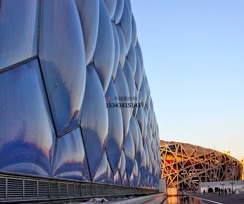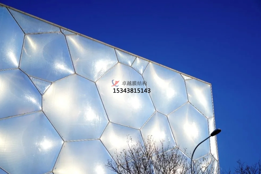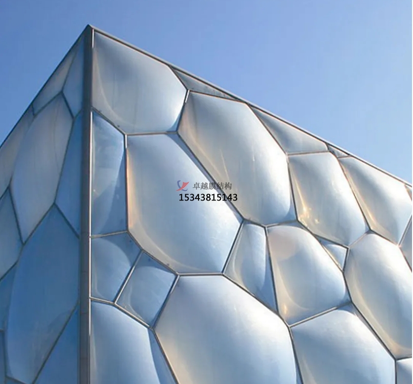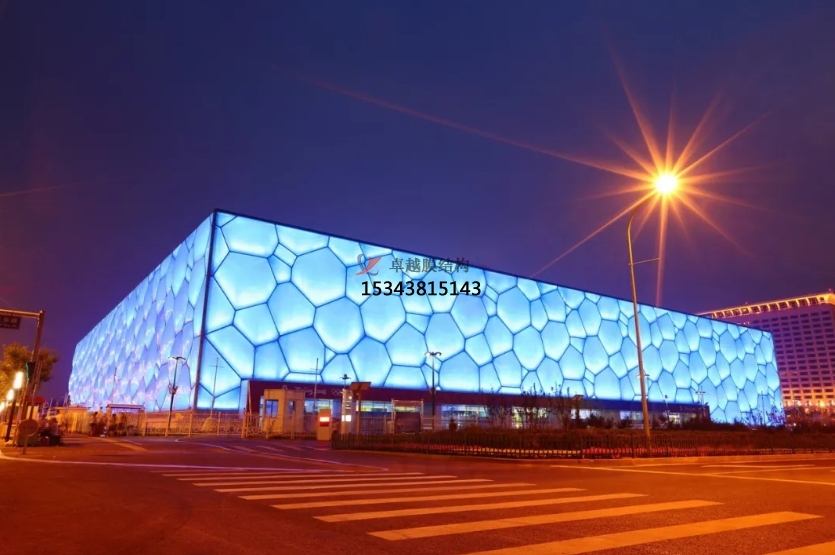 水立方是一座長寬177米乘177米,高31米的方型建筑,形狀看似隨意的建筑立面,但遵循著嚴(yán)格的幾何規(guī)則。水立方的幕墻由3800多個ETFE(四氟乙烯)氣枕組成,共有11種不同的形狀,內(nèi)層和外層均安裝充有惰性氣體的枕頭。
