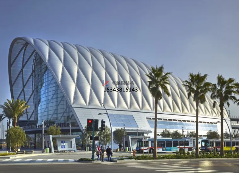美國南加州新一代公共交通設(shè)施:阿納海姆地區(qū)聯(lián)合運(yùn)輸中心。阿納海姆地區(qū)聯(lián)合運(yùn)輸中心建筑面積為67000平方英尺,建筑表皮采用菱形鋼拱的網(wǎng)格結(jié)構(gòu)系統(tǒng),由ETFE氣枕膜結(jié)構(gòu)組成。大跨度的網(wǎng)殼結(jié)構(gòu)創(chuàng)造的中庭空間寬敞明亮,可容納川流不息的人群。ETFE穹頂和膜結(jié)構(gòu)幕墻,一掃傳統(tǒng)火車站繁冗、沉重、空間昏暗的弊端,帶來一股清新簡潔的交通設(shè)施建筑風(fēng)格。