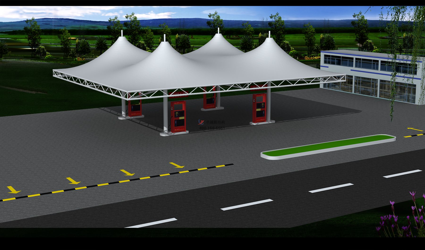項目結構形式:骨架式膜結構加油站加氣站,四面自然排水,一側與站房搭接。