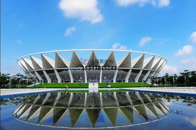 它的屋蓋為膜結構屋蓋,屋蓋呈圓環型,外徑310米,內徑125米。內環由10根直徑8厘米的鋼索組成的受拉環。外環是受壓環,分上下兩層,上層直徑310米,由直徑1米的鋼管混凝土組成;下層直徑275米,由直徑1.4米的鋼管混凝土組成,兩層鋼環間隔20m,中間由鋼管混凝土斜柱連接起來,形成倒圓臺形。