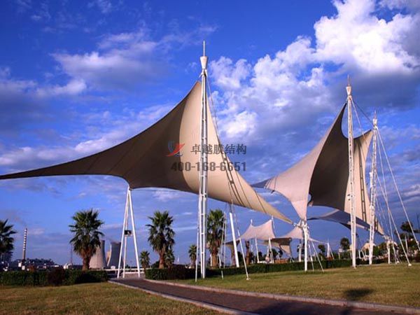 1、所謂膜結構又叫張拉膜結構,就是由支撐架構結合膜材所形成的建筑物或者構筑物,如今比較流行的支撐架構為鋼結構或者符合材料結構,膜材通常用的有三種PVC膜材、PTFE膜材、ETFE膜材,與傳統建筑形式相比膜結構的優點非常顯著:造型藝術、環保節能、力學性能好、防火抗震、自潔能力強、工期短經濟效益佳、應用范圍廣等,使其無愧為本世紀更現代與更充滿前途的建筑形式之一。如果您想了解跟多有關于膜結構方面的知識請關注鄭州卓越膜結構公司, 我公司在膜結構建筑方面已經有10年的經驗了,并且有著專業的設計和施工團隊,可以滿足客戶的各種需求,;從設計、施工、加工、安裝為一體專業廠家。下面我給小伙伴們展示下卓越在吐魯番地區完成的一批膜結構景觀經典案例,卓越公司在吐魯番周邊完成了吐魯番經濟開發區膜結構景觀、吐魯番騰達廣場膜結構景觀小品、吐魯番火車站膜結構景觀的設計施工,簡介如下: