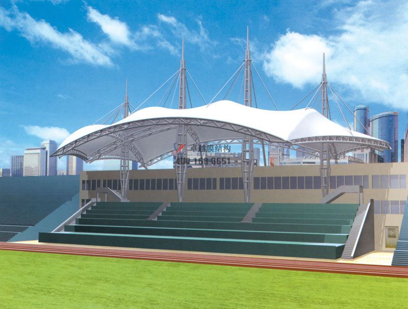 膜結構看臺在體育設施上主要應用在學校操場運動看臺或主席臺屋頂,另外大型體育場館看臺膜結構屋頂也屢見不鮮??磁_造型般由貝殼形峰膜及部張拉膜組成,形式新穎活潑。膜結構看臺將鋼架、索、膜巧妙結合,通過薄膜、膜邊索、脊索、谷索、拉索、拉桿及定的格構梁來穩定。膜頂平滑過渡,結構美觀、輕巧、整體造型相互輝映,別具格,接下來我們起來看看膜結構看臺的設計是怎么樣的。