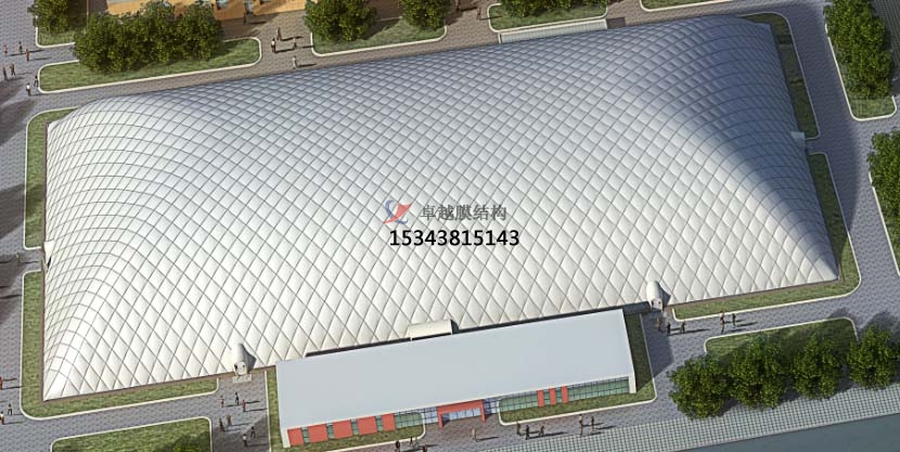 6、我司根據環境及應用場合的不同,把選好的“面料”(膜材)按尺寸裁剪,設計出各種獨特的建筑款式,再與“輔料”(加強構件,如鋼架、鋼柱或鋼索)結合通過一定方式使其內部產生一定的預張應力以形成某種空間。
