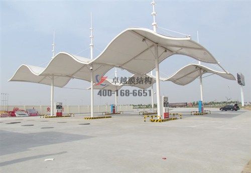 項目結構形式:骨架式膜結構加油站加氣站,四面自然排水,一側與站房搭接。