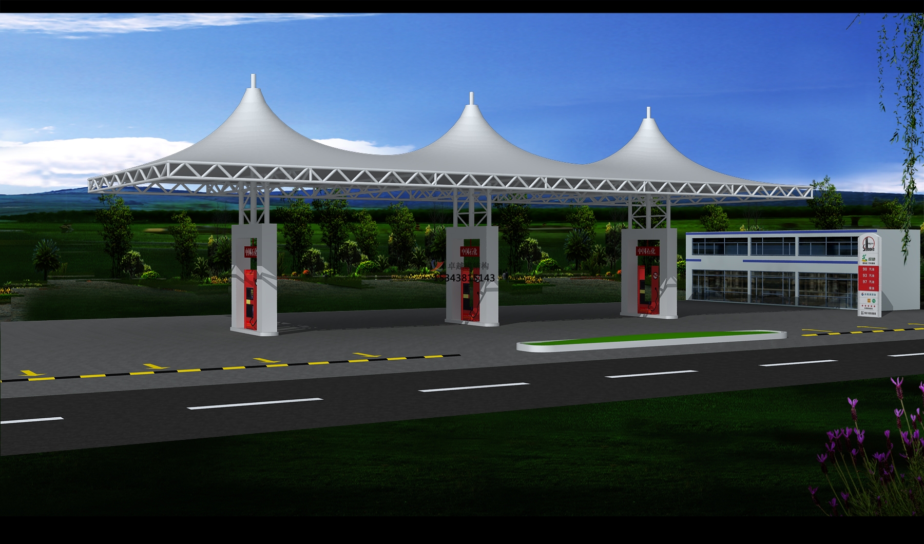 初始形態分析是工作人員在設計張拉膜的時候先要考慮的問題,張拉膜的穩定性能、三維平衡曲面性能等等,都需要設計人員對其進行一點一點的計算,這個過程是復雜的,它需要我們對加油站加氣站有著非常清醒的認識。