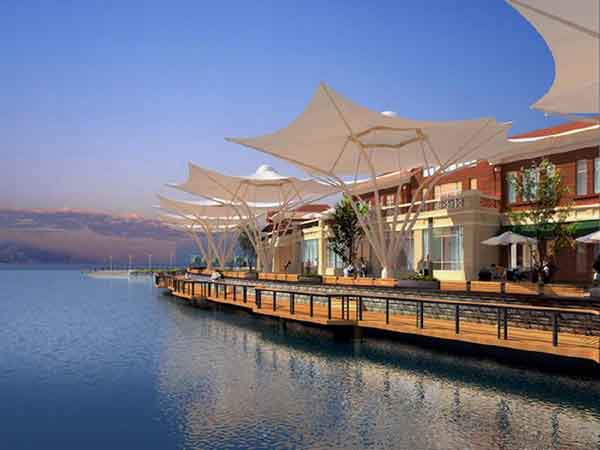PTFE 膜材是采用獨有的技術方法將玻璃纖維紗進行四氟化乙烯樹脂涂層的一種復合材料;其玻璃纖維絲具有超強的拉伸強度,它的強度遠高于鋼材,具有非常強的抗蠕變性能。該膜材的彈性模量遠低于其它膜材,這有利于膜材形成復雜的曲面造型;PTFE 建筑膜材的涂層表面由于自由能極低,使該產品具有高度的自潔性能;依靠自然的雨水沖刷,材料表面就能保持干凈和潔白,該表面完全惰性化 : 惡劣的環境,如霉菌,酸雨等將不對 PTFE 膜表面起作用;PTFE 材料中不含容易移出的增塑劑,抗氧化劑,紫外線吸收劑等;并且防潮,防霉,耐污性能良好,不沾性能卓越;能夠在 -80℃到 +250℃的溫度范圍內安全使用,具有良好的耐熱性,耐濕性,耐化學性等特性,即使在承受了暴風雪這類惡劣天氣后,膜結構仍然能維持初始狀態,膜材不會產生松弛。