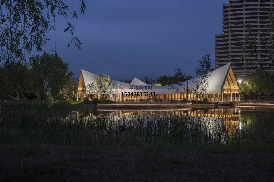 設計采用了新型鋼木組合結構,工廠預制,建造便捷,縮短工期。屋頂使用的是白色PVDF膜材,通過張拉性能實現三維屋面造型,勾勒出流暢的屋脊線,強化建筑簡潔、干凈的形體美感。