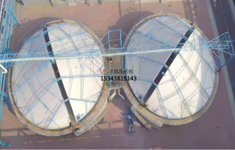 雙膜密封罩結(jié)構(gòu)是污水池上加蓋的一個(gè)氣囊,它由上下兩層氟碳纖維膜焊接而成,通過周邊與污水池池壁錨固,形成一個(gè)穩(wěn)定的受力結(jié)構(gòu),起到污水池內(nèi)惡臭氣體密閉的效果。雙膜密封罩結(jié)構(gòu)的優(yōu)點(diǎn)是結(jié)構(gòu)牢固、密封性好、防止水溫升高或降低,適用于工業(yè)水曝氣池或市政污水池。