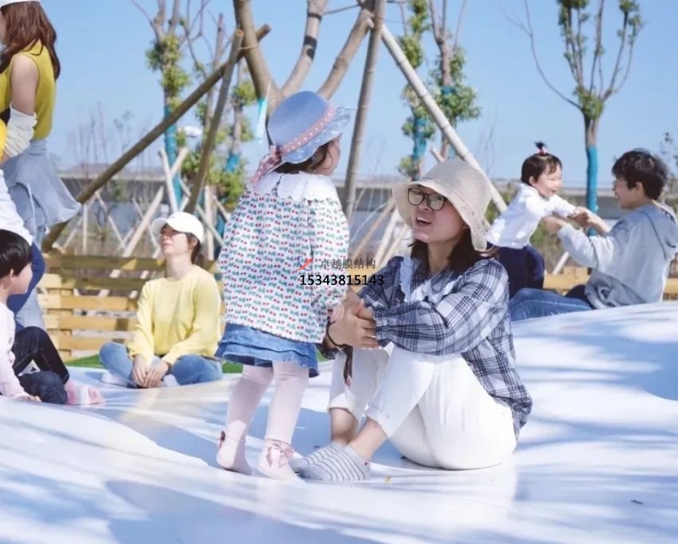蹦蹦云的外膜材質選用耐磨、抗陽光、自潔的膜材,保證外膜長期被人踩踏、暴曬、彈跳后,再次清洗后依然清潔。產品可長久性的固定在地面之上,拆卸維修方便。
