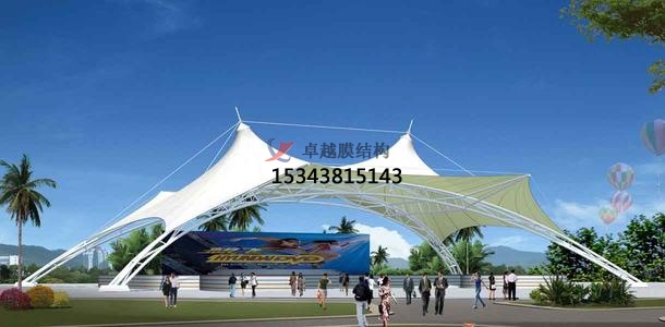 用于張拉膜景觀中的高強度柔韌薄膜稱膜材,它是一種耐久用、高強度的涂層織物,由織物和涂層復(fù)合而成,具有質(zhì)地柔韌、厚度小、重量輕、透光性好的特點。對自然光吸收和透射能力、阻燃,具有良好的耐久、防火、氣密等特性;