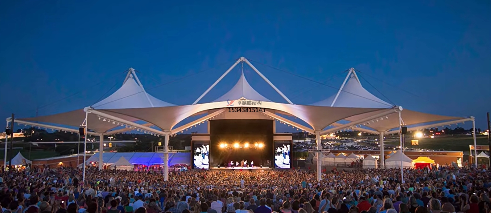 舞臺膜結構遮陽棚以其獨特的藝術魅力和實用的功能特性,逐漸成為眾多演出場所的首選。它不僅為舞臺表演提供了理想的遮陽和防雨解決方案,還通過其創新的設計和多樣化的造型,為觀眾帶來了全新的視覺體驗。