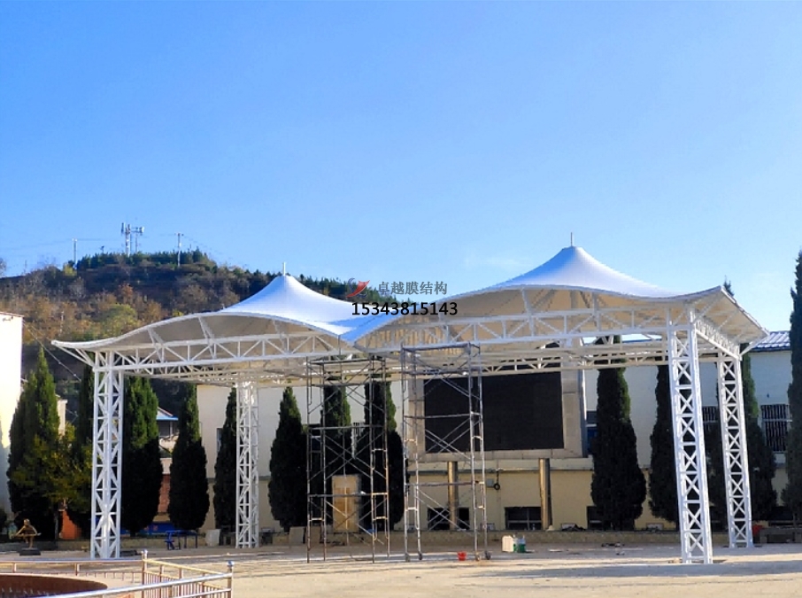 舞臺膜結構遮陽棚的膜材料具有一定的透光性,可以根據演出需要調節光線的明暗和色彩。在白天,自然光透過膜材料灑落在舞臺上,為演出增添了一份自然和溫馨;在夜晚,舞臺燈光與膜材料的透光性相結合,可以營造出夢幻般的舞臺效果。