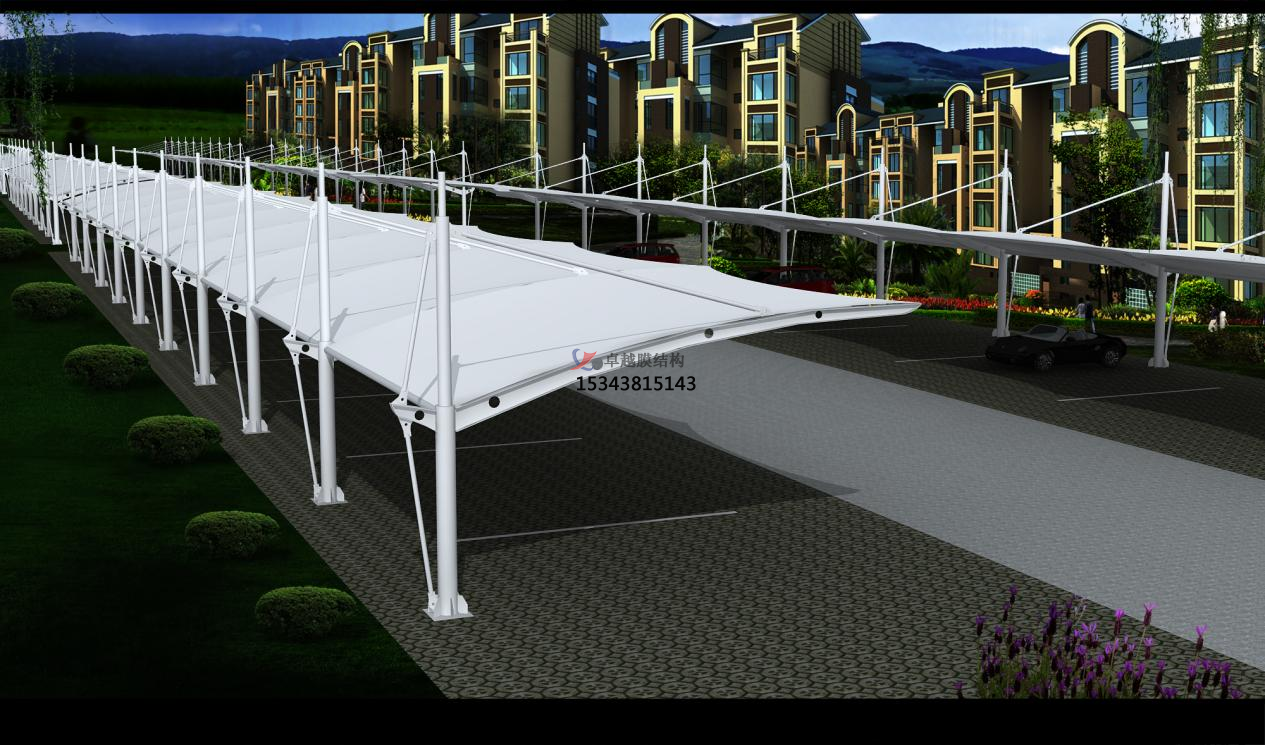 膜結構車棚的藝術性:膜結構車棚值得一提的是它能夠經過支撐構件的方位和凹凸擺放組成不同的形狀,這在金屬車棚上是無法幻想的。如在車棚頂部經過拉伸索,使膜結構布邊緣向上翻起。這要是在彩鋼上只能經過對彩鋼板進行預熱加工才行,需求消耗較大的價值。
