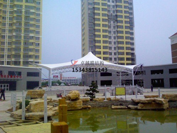 2、 混凝土結構主體加鋼拱:以上兩種更簡單的膜結構,依平面的形狀,如方形、菱形等,可有許多變化,拱的間距依使用的膜材強度、設計荷載、風力等確定。